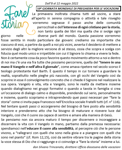 59° GIORNATA MONDIALE DI PREGHIERA PER LE VOCAZIONI Unità Pastorale 08/05/2022 Editoriali Navigazione articoli Precedente Articolo precedente: PASQUA DI RISURREZIONEÉ POSSIBILE RICOMINCIARE SEMPRESuccessivo Articolo successivo: E’ GIUNTO IL MOMENTO DI PASSARE IL TESTIMONE
